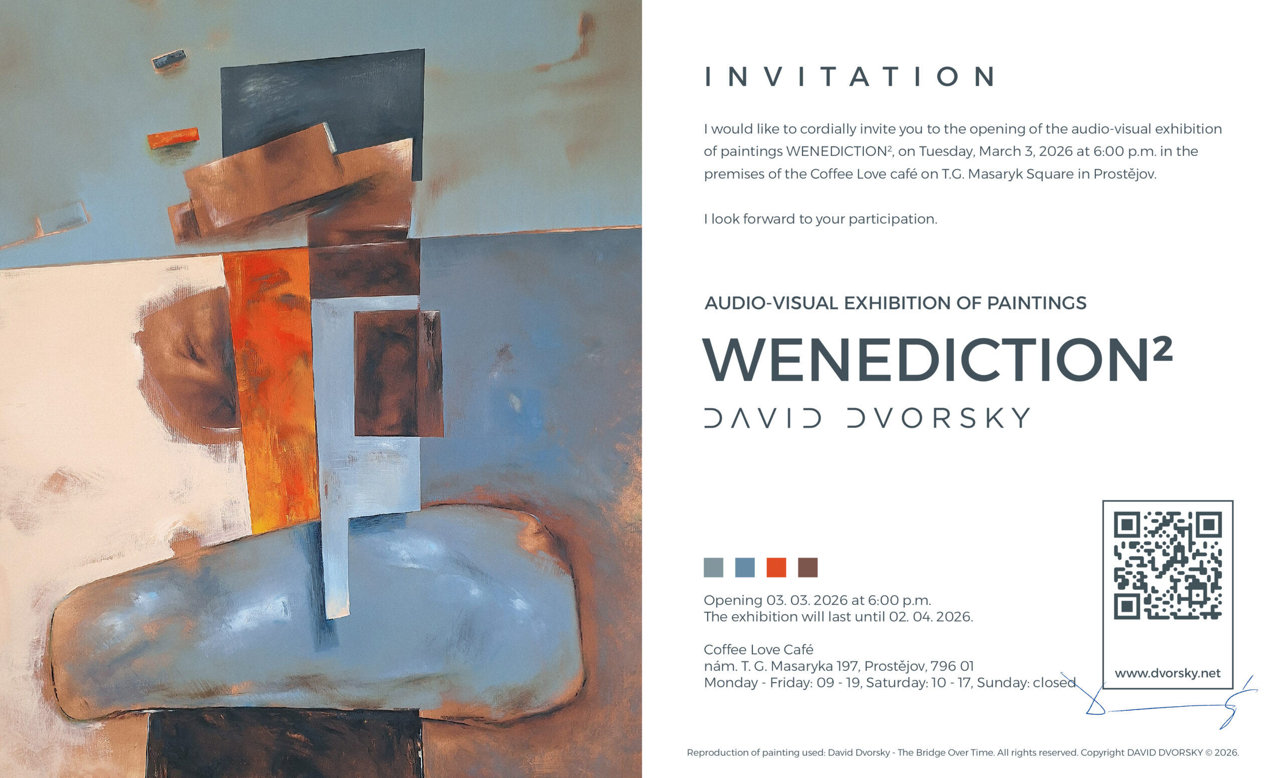 I would like to cordially invite you to the opening of the audio-visual exhibition of paintings WENEDICTION2, on Tuesday, March 3, 2026 at 6:00 p.m. in the premises of the Coffee Love café on T.G. Masaryk Square in Prostějov. The exhibition will last until 02. 04. 2026.